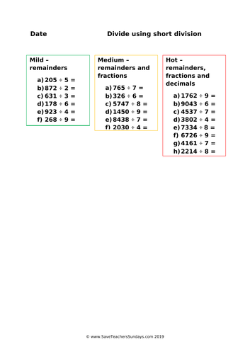 Grade 5 Multiplication & Division Worksheets | K5 Learning Web5th grade multiplication and division worksheets, including multiplying in parts, multiplication in columns, missing factor questions, mental division, division with remainders, long division and missing dividend or divisor problems. No login required. Worksheets for division with remainders - Homeschool Math Students usually learn division with remainders right after learning single-digit division, in 3rd or 4th grade. The worksheets on this page are divided into two major sections: Division with remainders — long division; Division with remainders — mental math; Basic instructions for the worksheets. Each worksheet is randomly generated and ...
